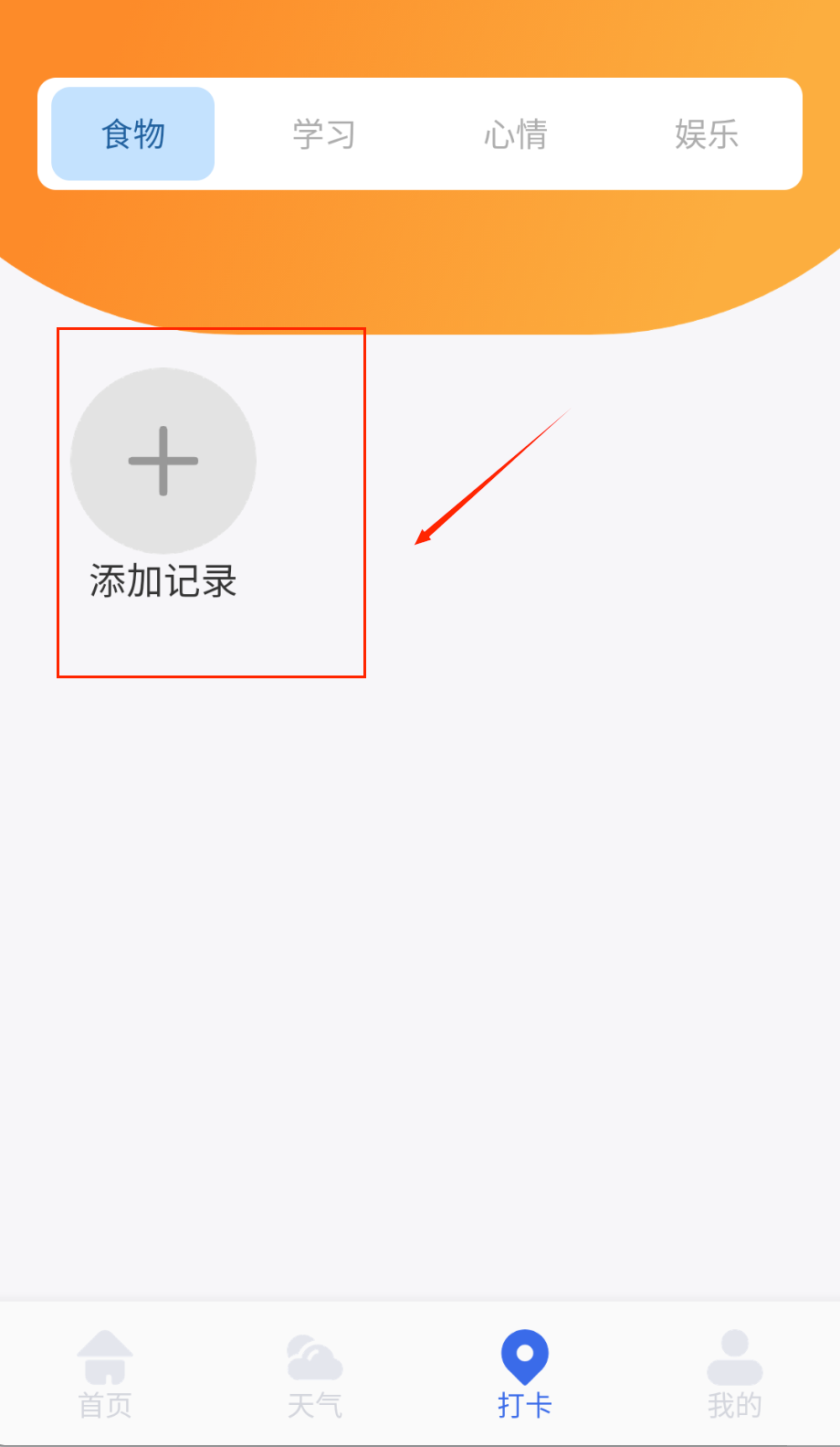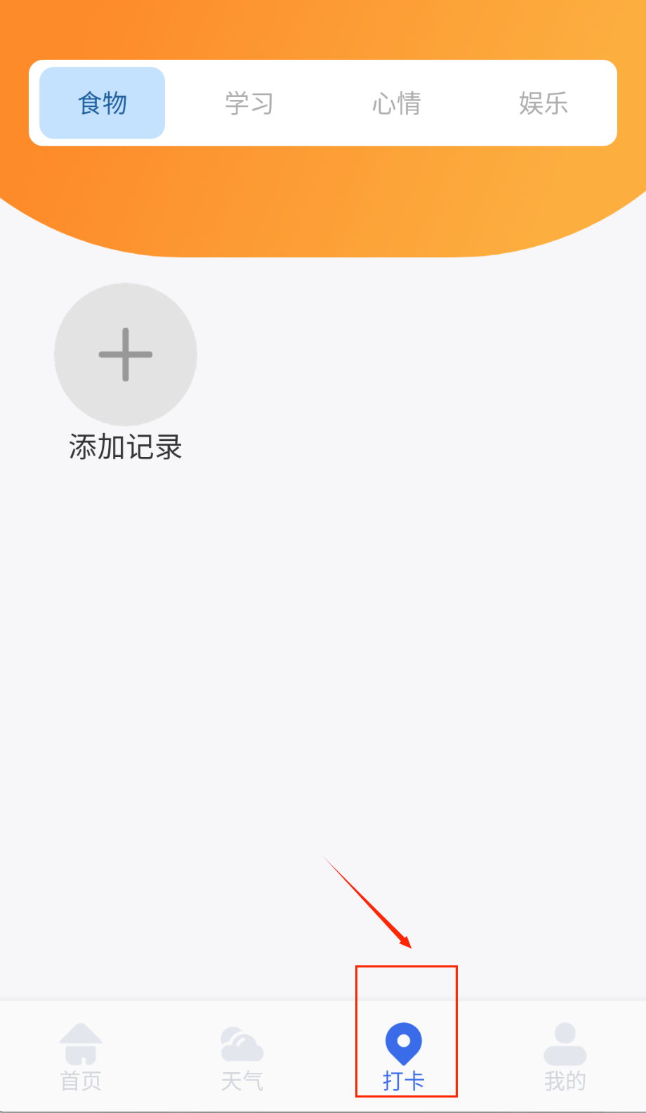 1、登录账号后进入主界面,根据记录内容选择对应分类标签,比如饮食记录选"食物",学习进度选"学习",确保分类准确便于后续查看。