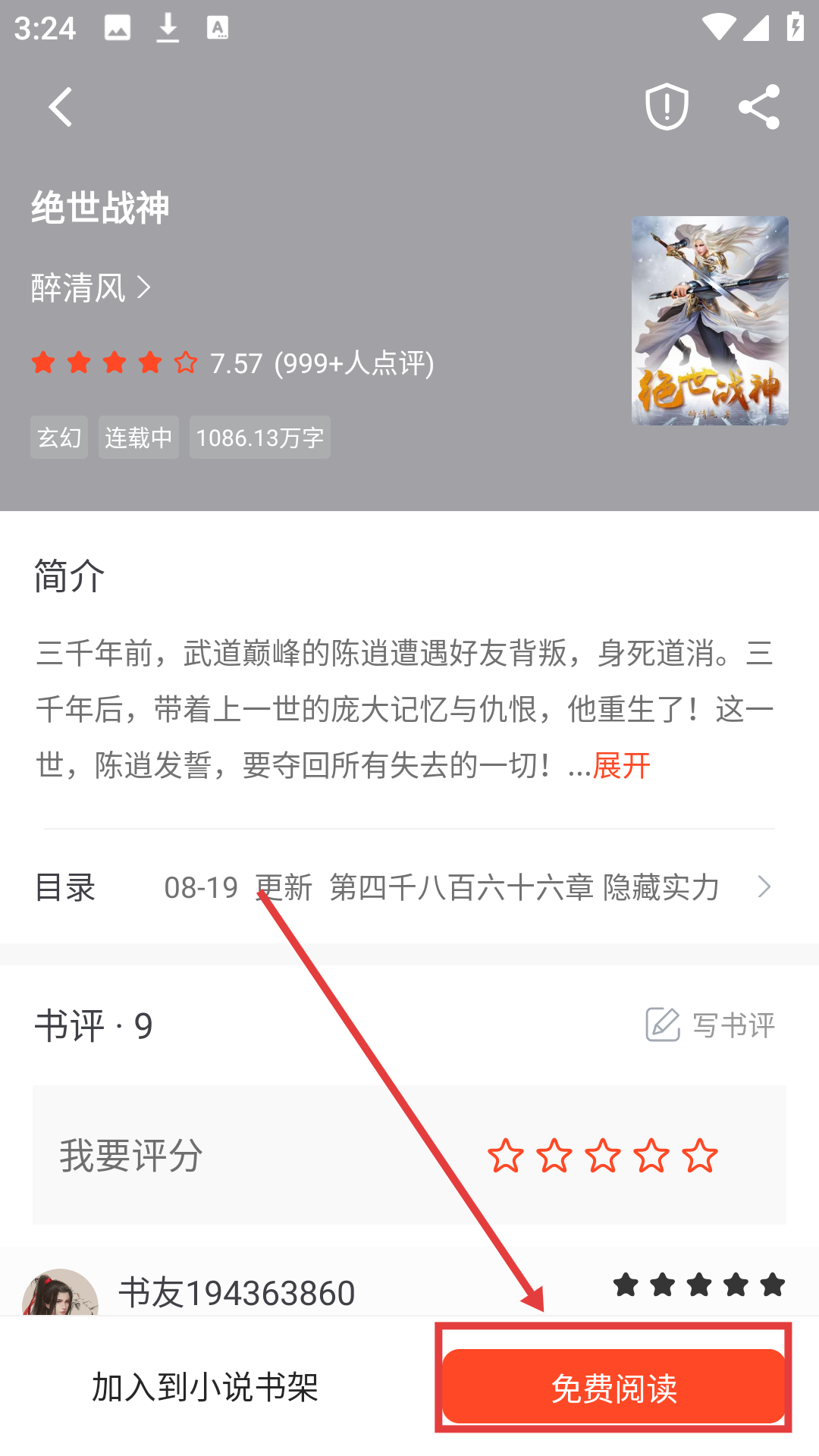 1、在书籍详情页,点【免费阅读】,可进入阅读页面开始看书哦。
