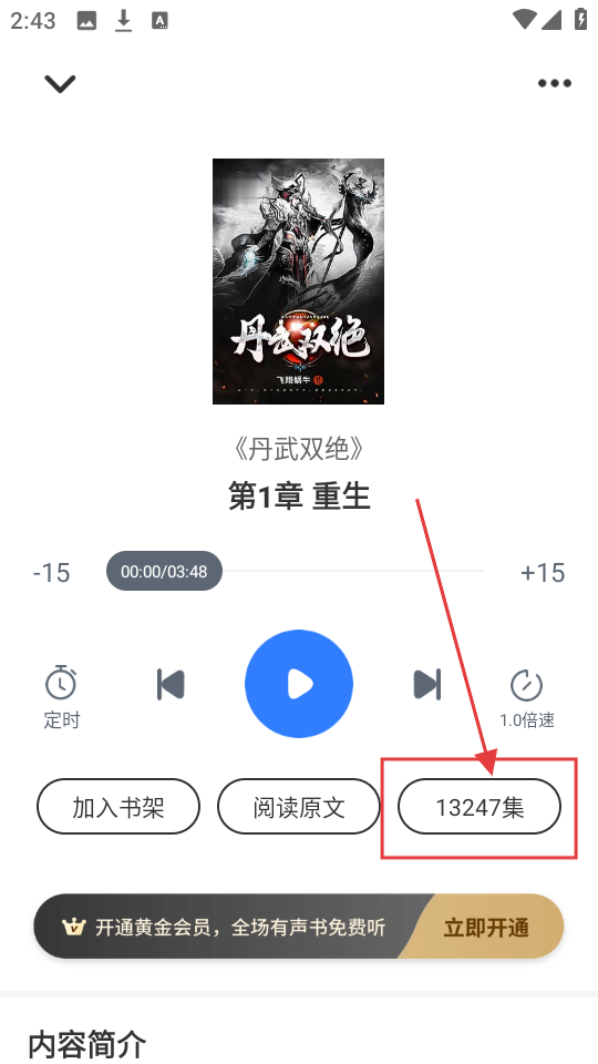 2、在书籍详情页点击【同名有声书立即收听】,就能进入有声书收听界面啦。