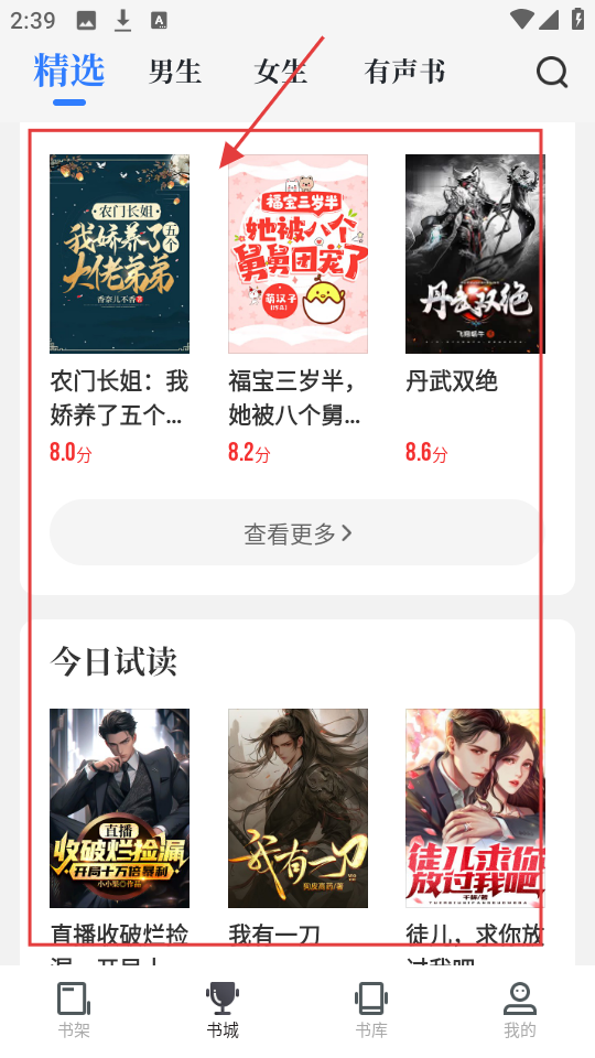 1、在书城精选页面,可浏览推荐书籍和今日试读书籍,找到感兴趣的书籍啦。