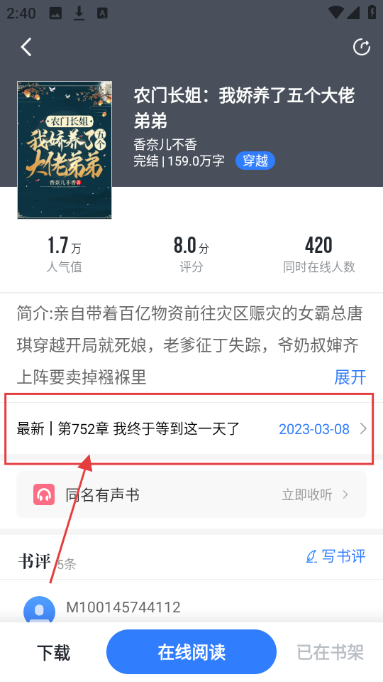 2、进入书籍详情页后,点击章节区域,可查看书籍的章节列表哦。