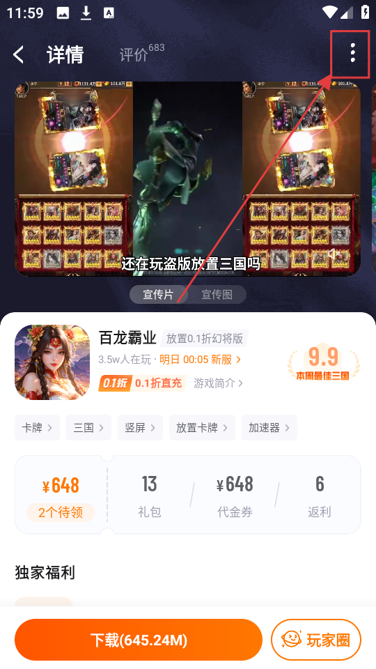 2、进入游戏详情页后,点击右上角的三点图标,就能打开更多功能选项啦。
