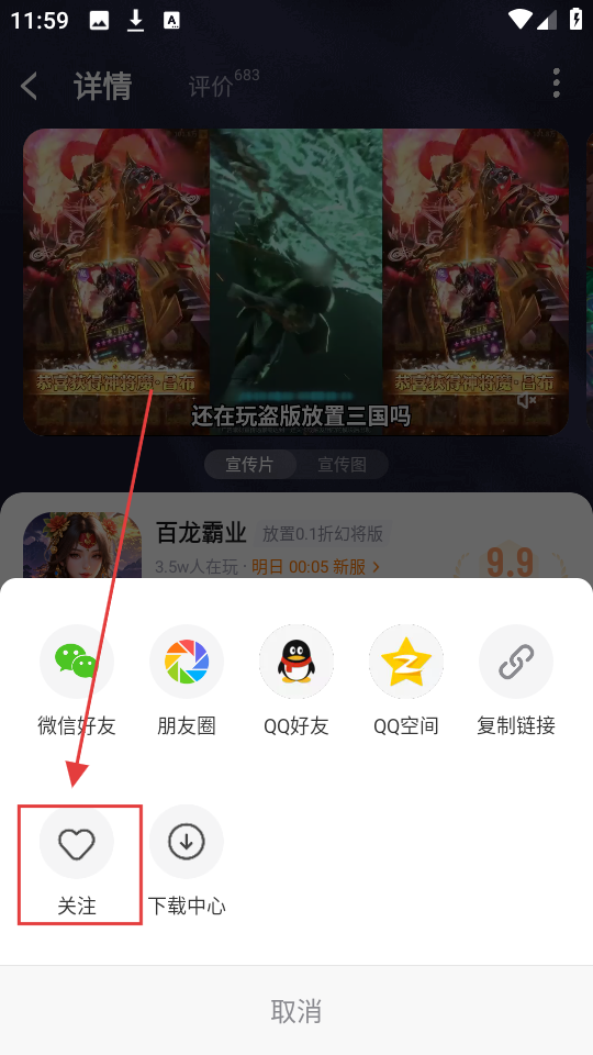 3、在更多功能选项里,点击【关注】,就能关注这款游戏,方便后续查看动态哦。