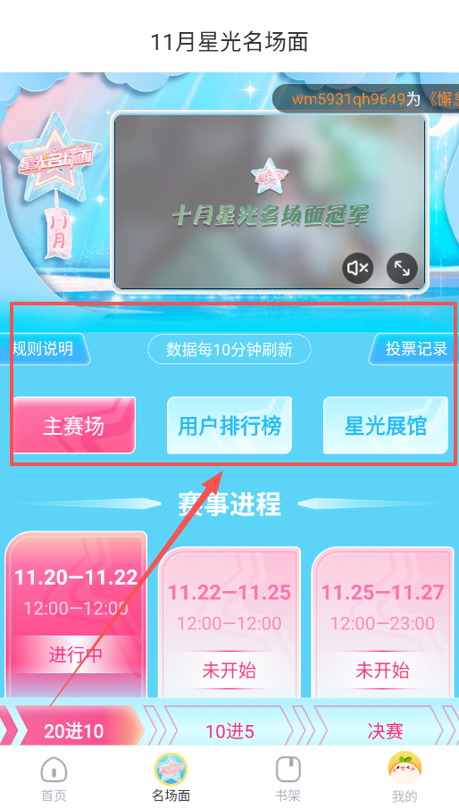 3、名场面投票功能使用步骤,点击底部名场面进入活动页面,这里会展示月度星光名场面赛事。