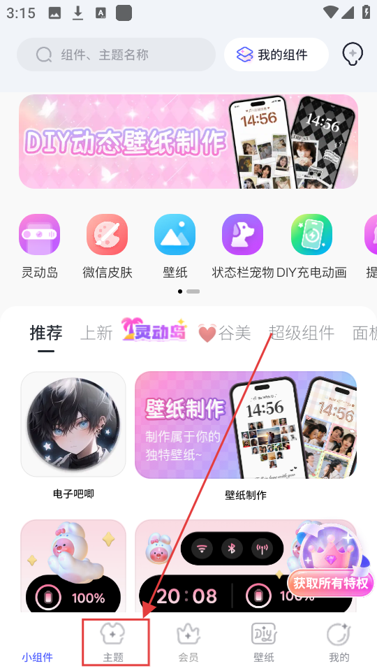1、我们在软件界面,点击底部的【主题】,就能进入主题页面,查看各类主题啦。
