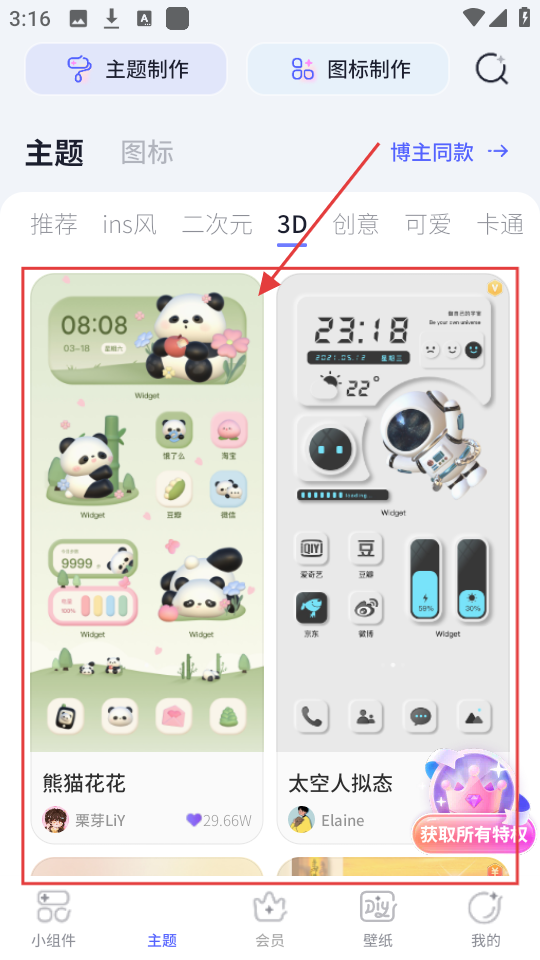 3、选择主题分类(如“3D”)后,我们能看到“熊猫花花”“太空人拟态”等主题,挑选心仪的主题。