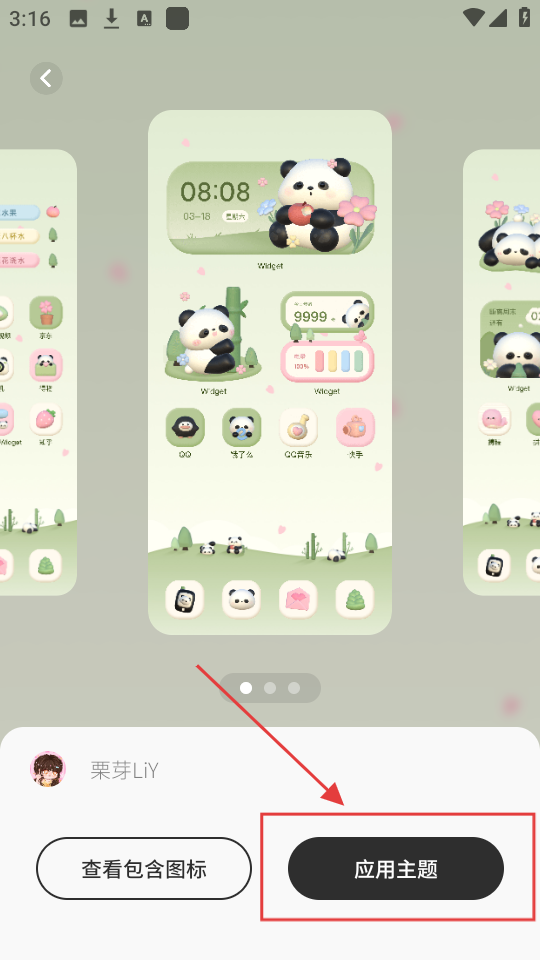 4、选中心仪的主题(如“熊猫花花”)后,我们点击【应用主题】,就能将该主题应用到软件界面啦。