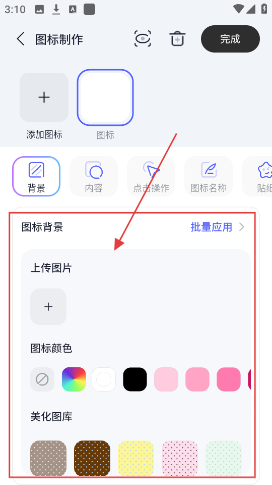 2、进入图标制作界面后,在背景设置区域,可上传图片或选择图标颜色、美化图库样式来设置图标背景哦。