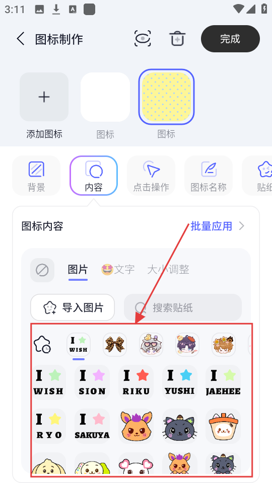 3、设置好图标背景后,切换到内容设置区域,能从众多贴纸等素材里挑选喜欢的,添加到图标上呢。