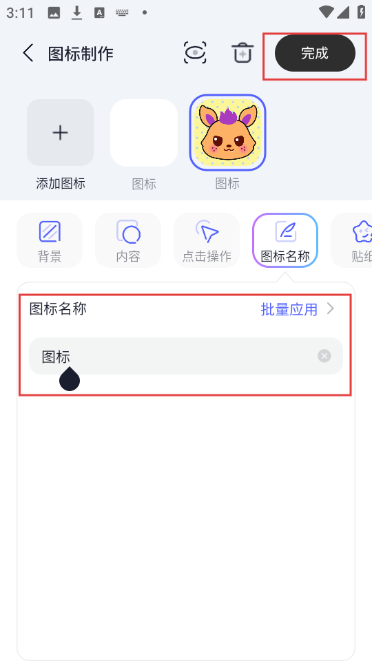 4、图标背景和内容都设置好后,还能设置图标名称,最后点击【完成】按钮,就制作好图标啦。