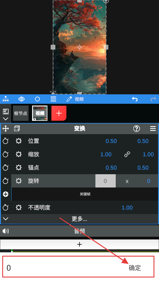 2、在变换设置区域,能看到旋转参数,现在旋转值是0,想调整视频旋转角度就看这里哟。