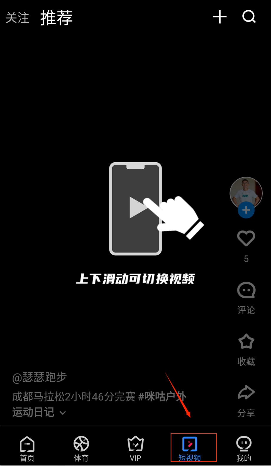 2、短视频板块是消遣好去处,上下滑动切换不同视频,比如跑步教学、影视剪辑等,注意视频下方的收藏和分享按钮,方便保存精彩内容哦。