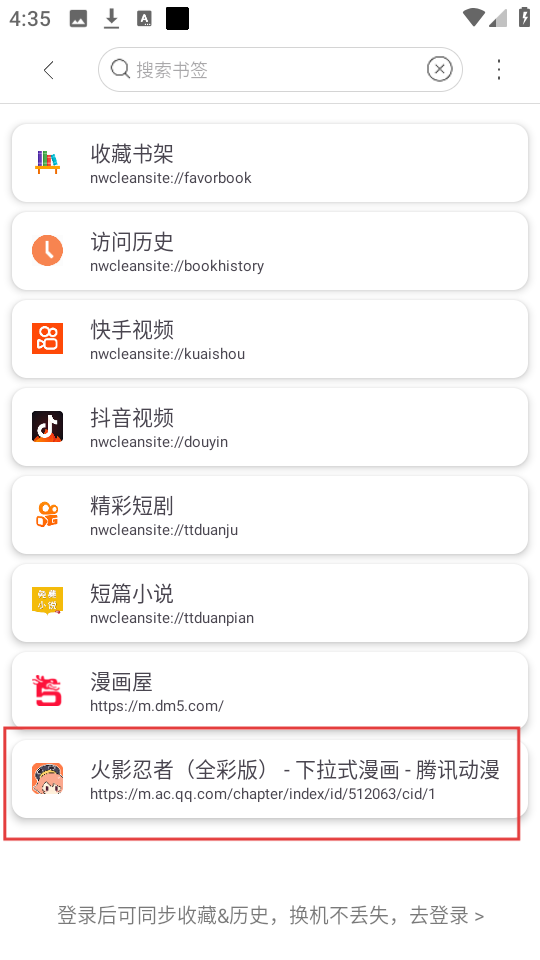 4、进入书签列表页面,能看到刚添加的【火影忍者(全彩版)】书签,下次想读时可直接点击访问啦。
