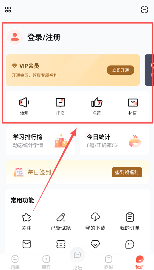 1、首先打开医考帮app,在首页可以看到学习排行榜和今日统计,点击每日签到领取积分,最后别忘了在个人中心查看学习数据。