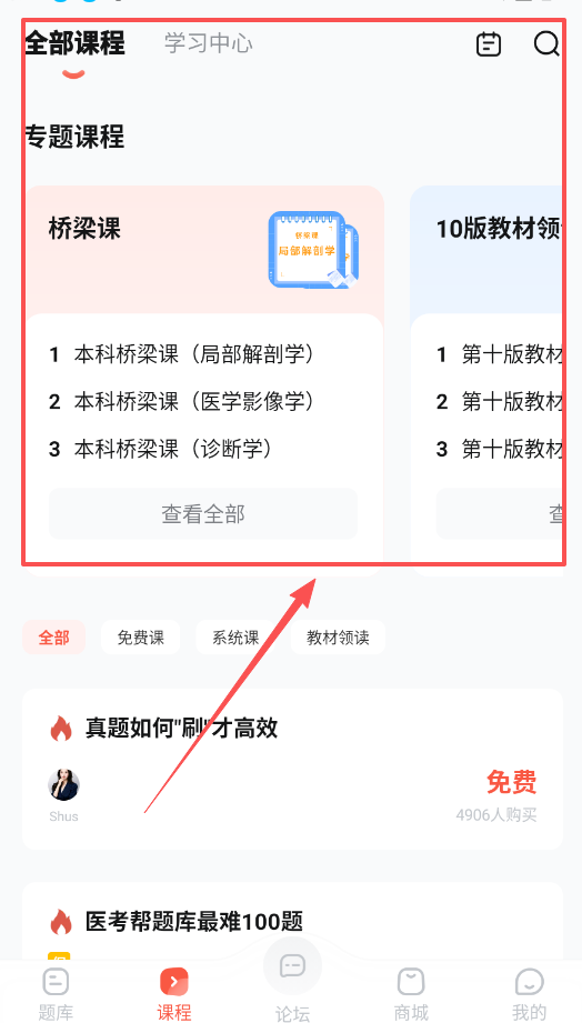 3、课程中心分为专题课程和桥梁课等类型,第十版教材领读适合基础复习,搜索框输入“真题如何刷”能找到高效备考技巧。