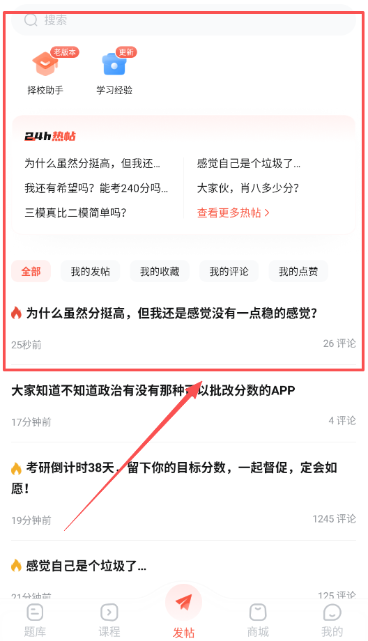 4、论坛功能藏在底部导航栏,点击就能看到择校助手和学习经验板块,私信功能还可以和其他考生单独交流。