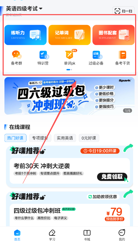 2、登录后进入首页,你会看到丰富的学习功能,比如练听力、记单词和图书配套,备考区还有特训营和单词PK等。