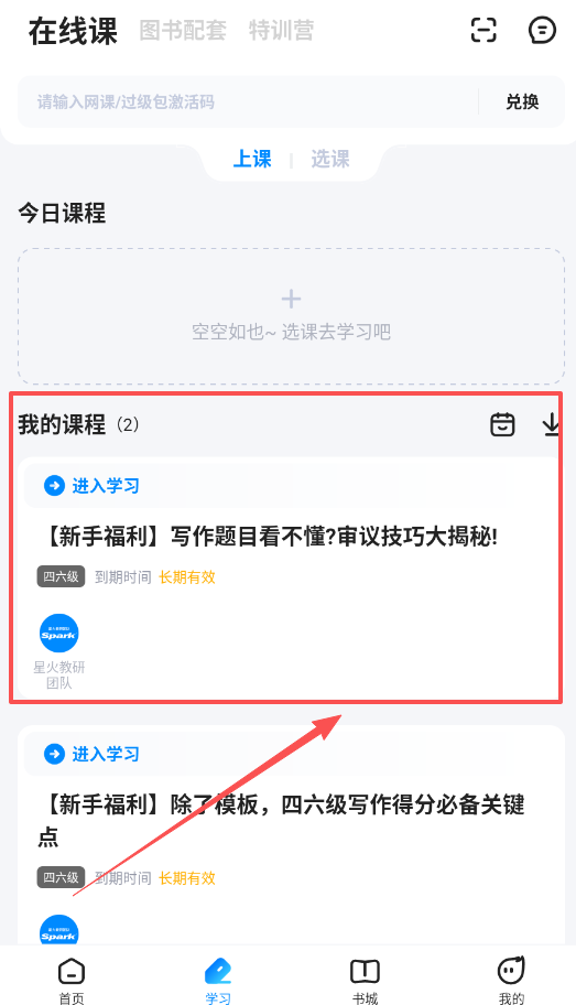 3、在学习页可以查看和管理你的课程,输入激活码兑换网课或过级包后,就能在今日课程或我的课程里找到。