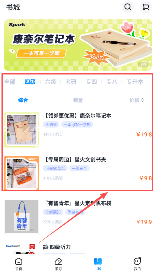 4、书城页提供各种学习用品,比如康奈尔笔记本和文创周边,你可以按四级、六级等分类筛选,或按销量、价格排序。