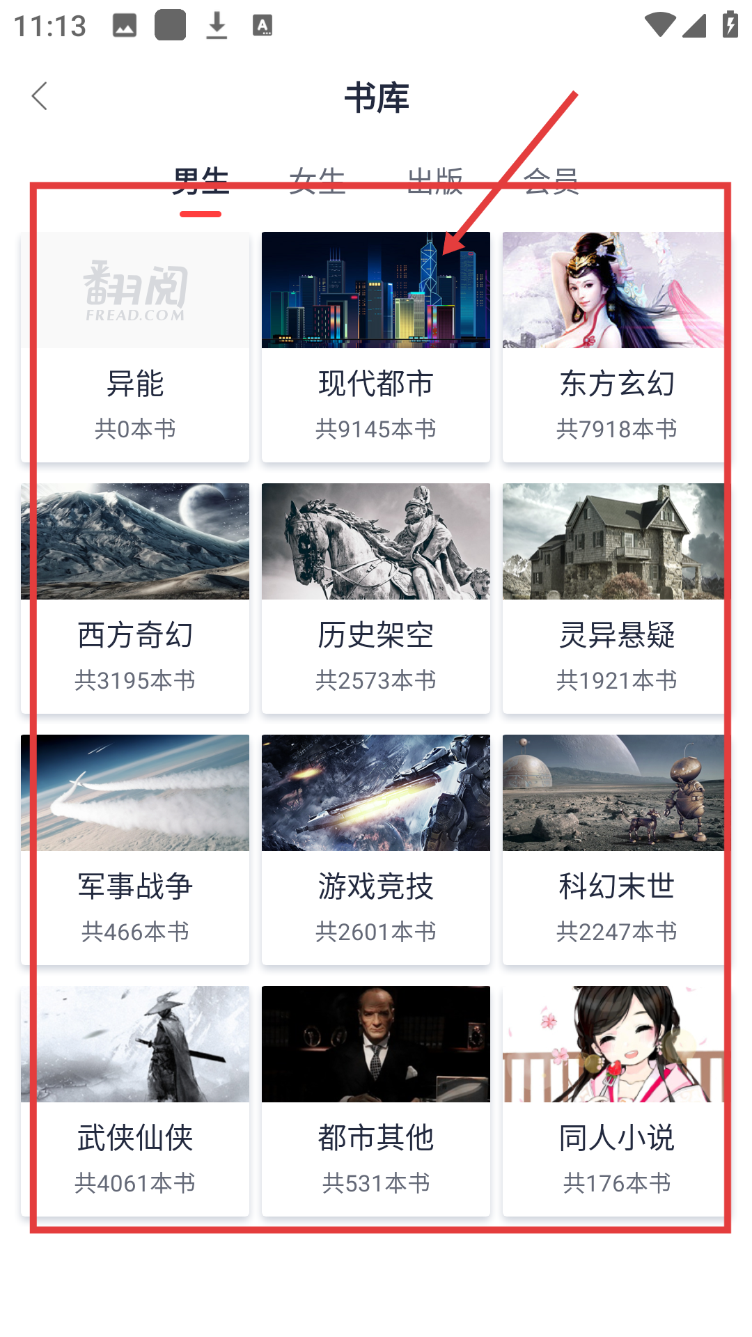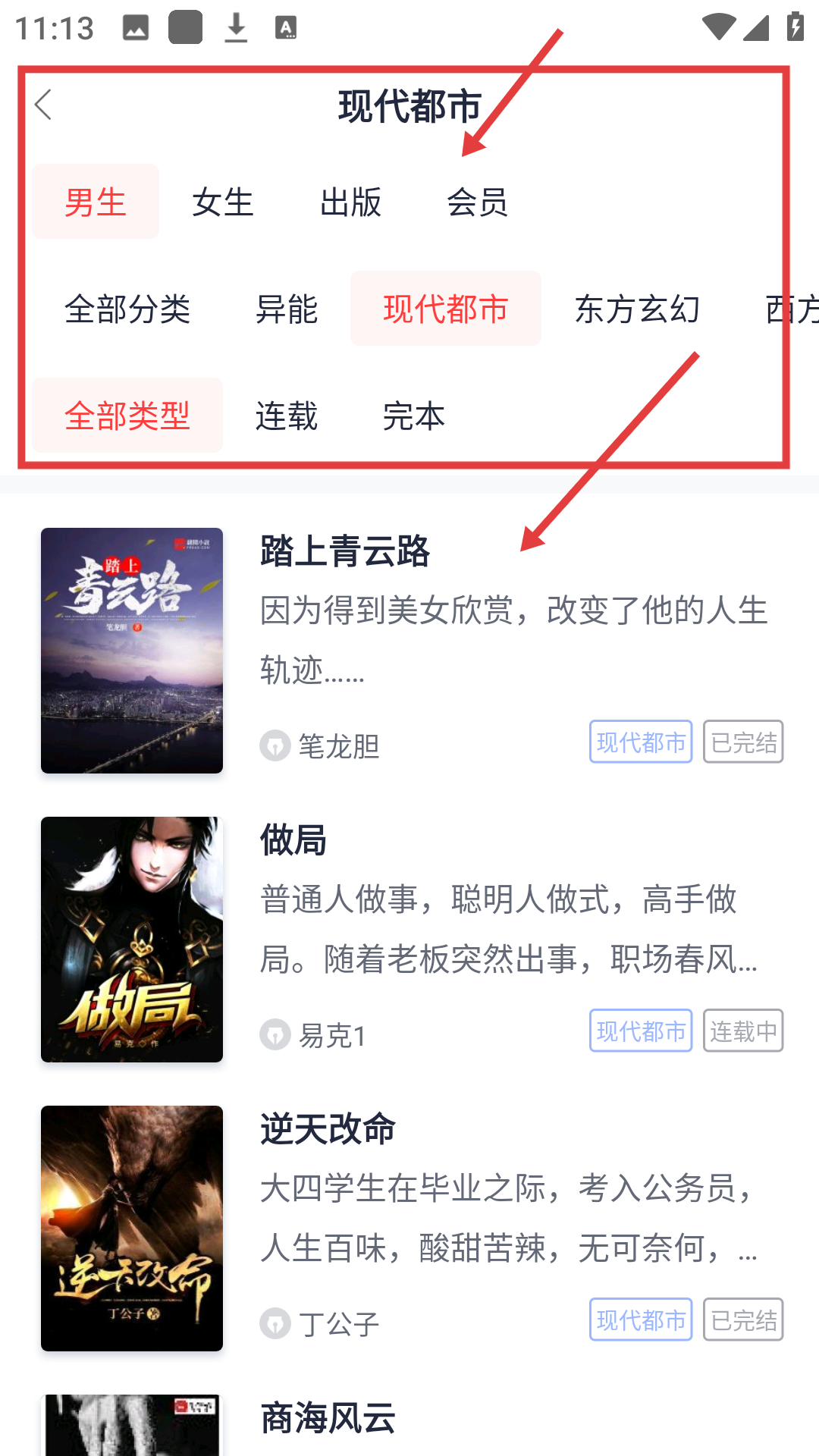 2、在书库界面挑选小说类别,如【现代都市】,点击就能进入该类别小说列表啦。