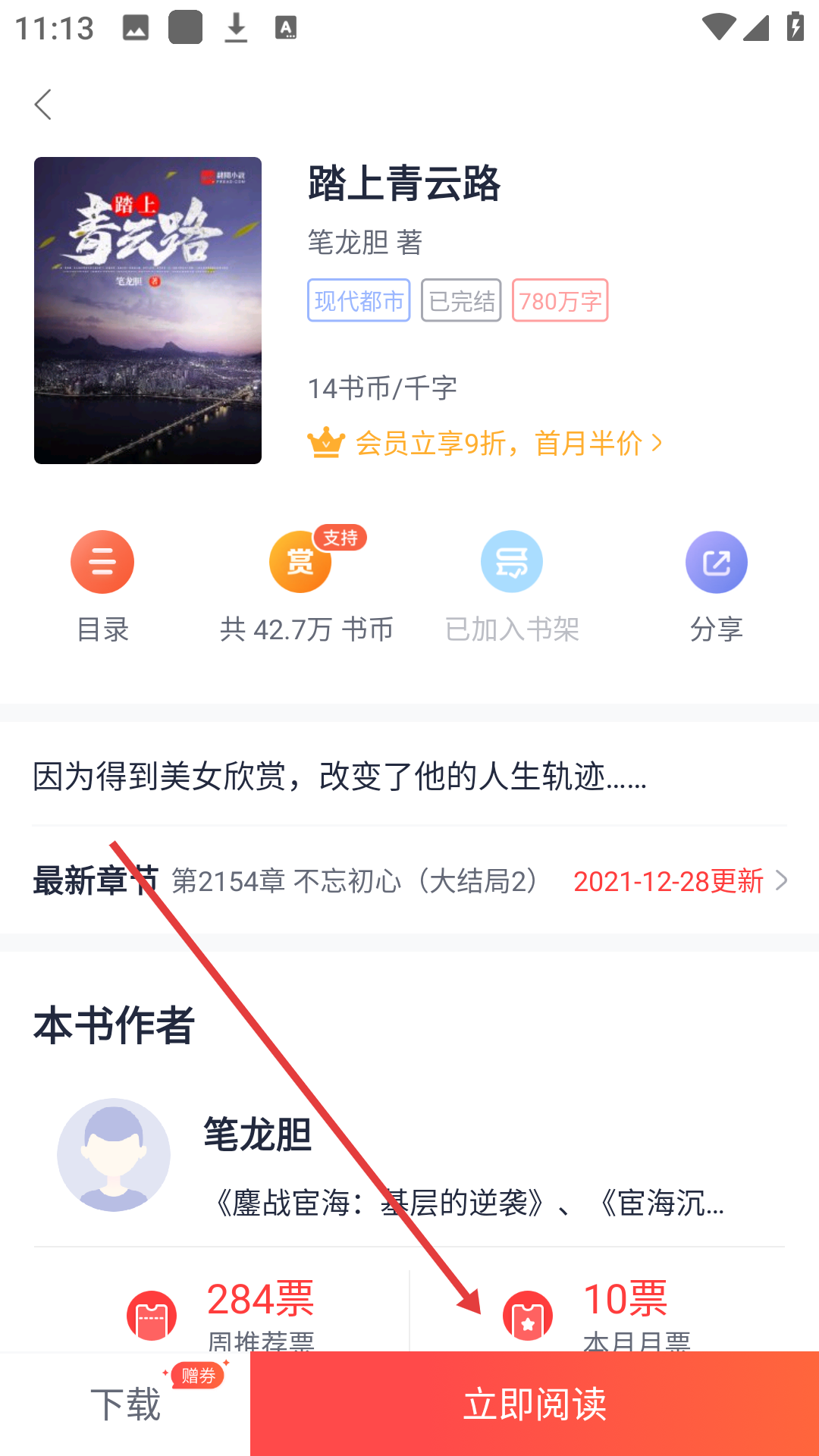 4、在小说详情界面点击【立即阅读】,即可开始阅读该小说,沉浸在剧情里啦。