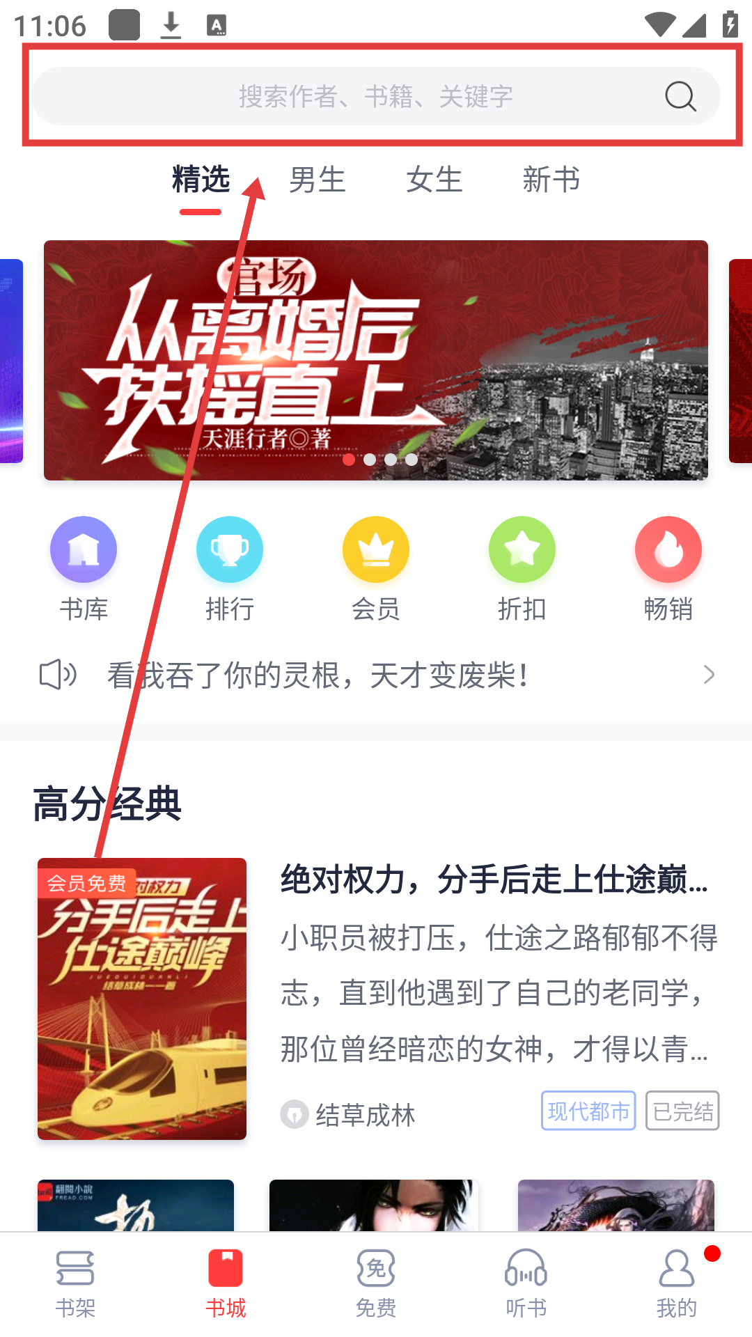 1、在书城页面,点击顶部搜索框,可进入搜索页面,准备查找书籍啦。