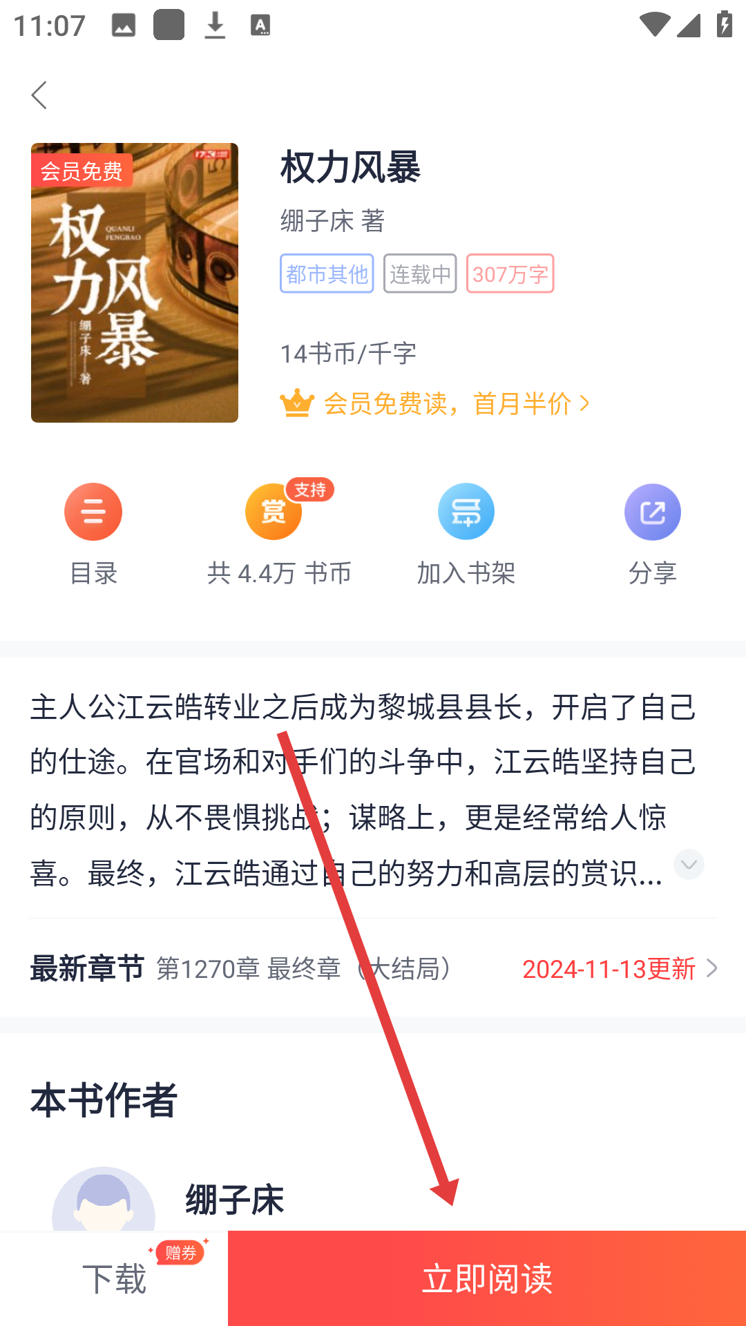 4、在书籍详情页,点击【立即阅读】,即可开始阅读书籍,享受阅读乐趣哦。