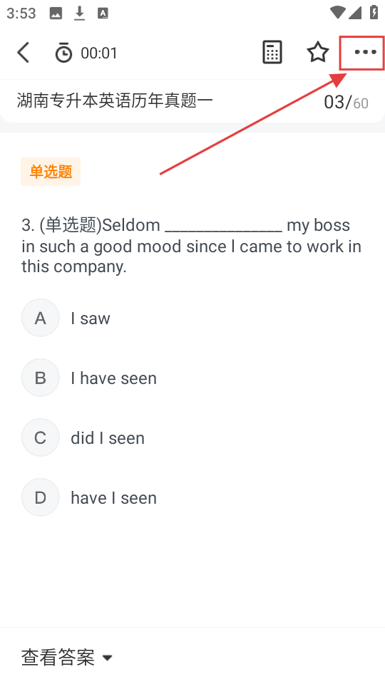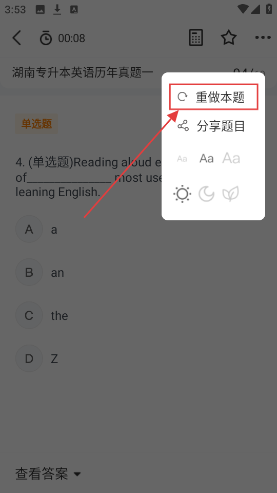 1、做题时,若想重新做或分享题目,点击右上角的【···】按钮,就能调出功能选项啦。
