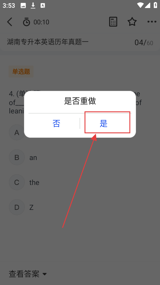 4、确认重做后,就会回到本题目重新开始,能再次思考选择答案,加深对知识点的掌握哦。