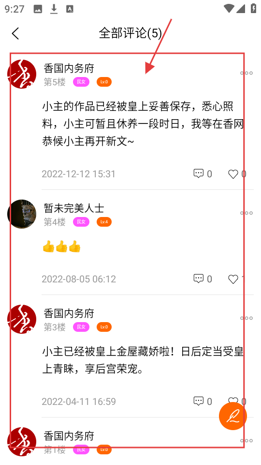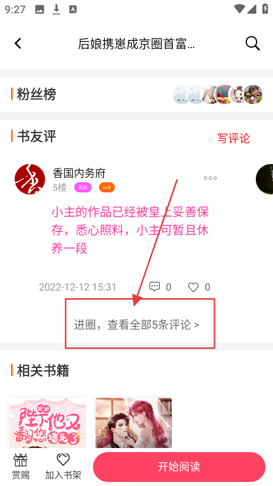 1、在小说页面点击【进圈,查看全部5条评论】,就能看到所有书友的评论啦。