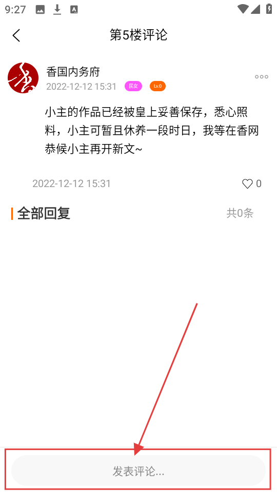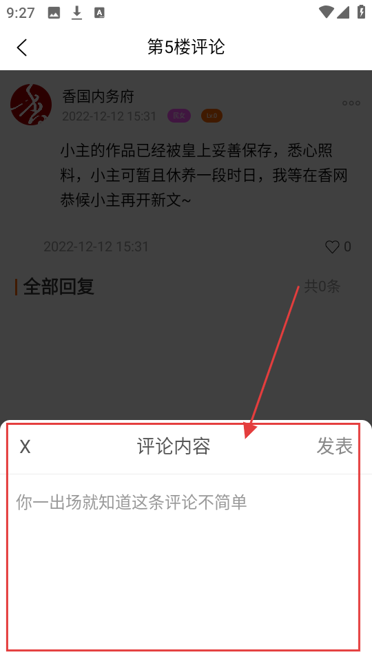 4、在评论输入框填写内容后点击发表,就能和书友们交流对小说的看法啦。