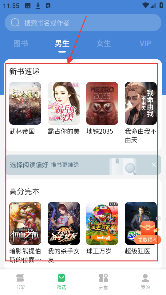 1、在精选页面的男生板块,找到喜欢的小说,比如《霸占你的美》,点击进入详情页哦。