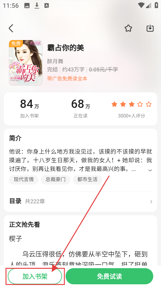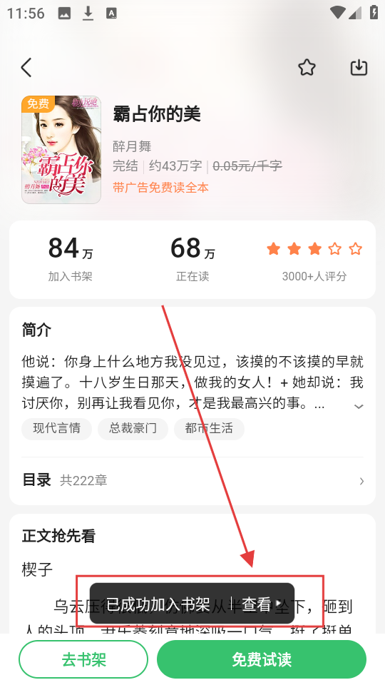 2、在小说详情页点击【加入书架】,就能把《霸占你的美》添加到书架,方便后续阅读啦。