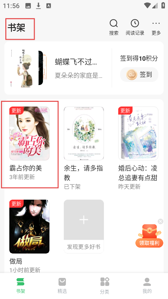 4、点击【书架】,就能看到添加的《霸占你的美》,快速进入阅读啦。