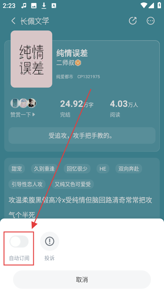 3、展开更多操作选项后,找到【自动订阅】开关,点击它就能开启自动订阅功能呢。