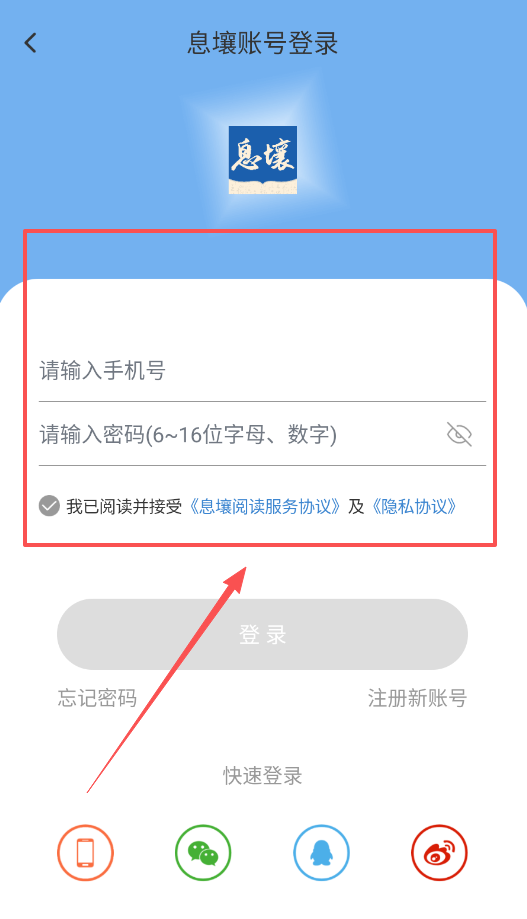 1、首先打开息壤阅读app,在登录页面输入手机号和6-16位密码,记得勾选同意服务协议和隐私条款,然后点击登录按钮。