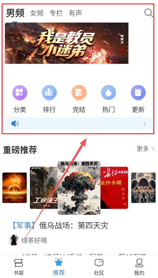 2、进入首页后可以看到男频女频等分类标签,通过底部的分类、排行、完结等标签能快速筛选书籍。
