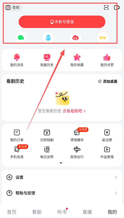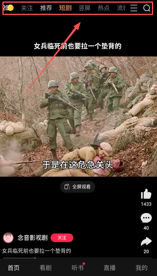 2、想看短剧或影视内容,可在首页选择看剧页签,上方有关注、推荐、短剧、坚屏、热点等分类标签供你筛选。