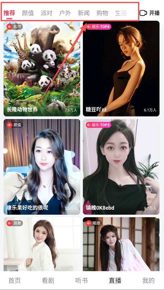 4、软件还提供直播功能,在直播页面中,有推荐、颜值、派对、户外等多种频道,丰富你的娱乐生活。