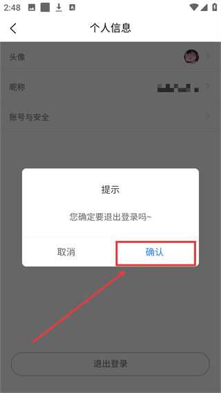 4、弹出退出提示框后,点击【确认】按钮,就能完成当前账号的退出操作啦。