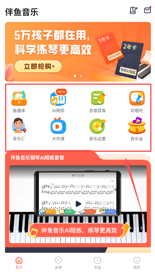 2、进入首页后能看到曲谱库、大师课、音基题库等核心板块,想找特定教材的话可以点击曲谱页的搜索框。