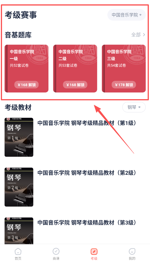 3、考级备考的同学可以切换到考级专区,这里按中国音乐学院等权威机构分级整理了音基题库,选择对应级别支付解锁后就能刷题了。