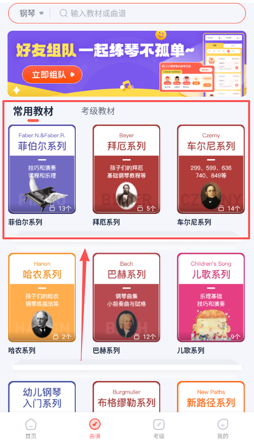 4、使用过程中记得善用底部的导航栏,在曲谱页按系列分类浏览常用教材,在考级页查看最新赛事,在我的页面管理个人学习记录。