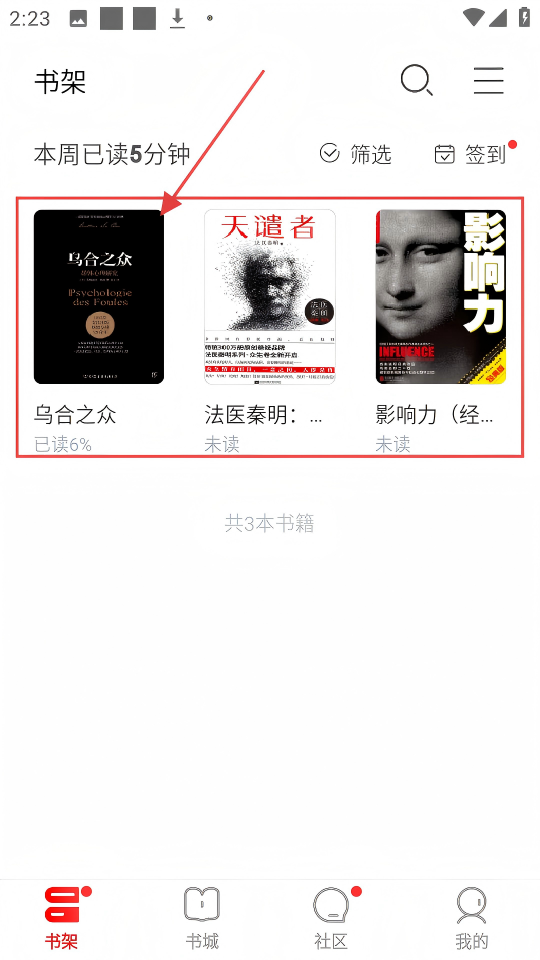 1、在书架,能看到《乌合之众》《法医秦明》等书籍,想阅读哪本,点击对应的书籍封面就行啦。