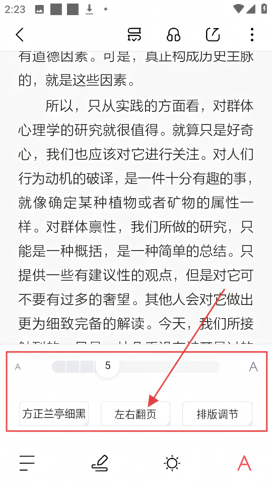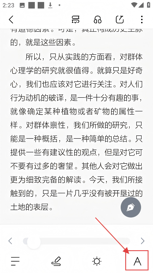2、进入书籍阅读页面,点击右下角【A】图标,能调出字体、翻页等设置选项,超方便的。