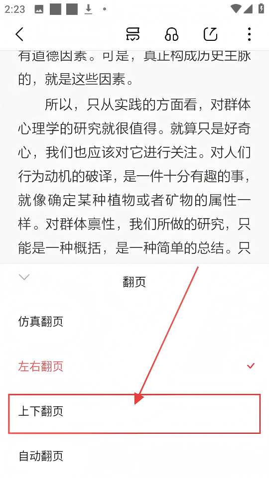 4、若想换翻页方式,在翻页设置里,点击【上下翻页】,就能切换成上下翻页模式啦。