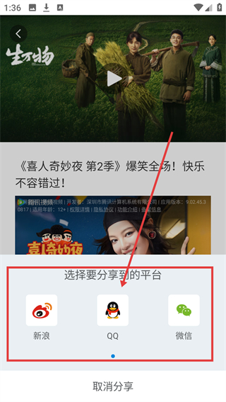 3、在分享平台选择菜单中,可选择新浪、QQ、微信等平台,点击对应平台图标,进入该平台的分享流程啦。