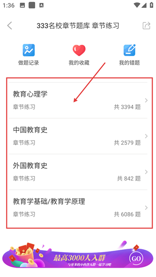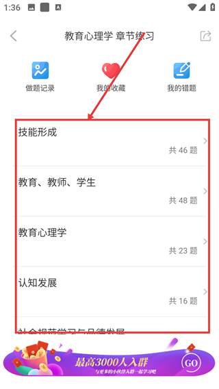 3、选定题库后,点击对应学科(如【教育心理学】),进入该学科的细分章节列表,精准定位复习内容呀。