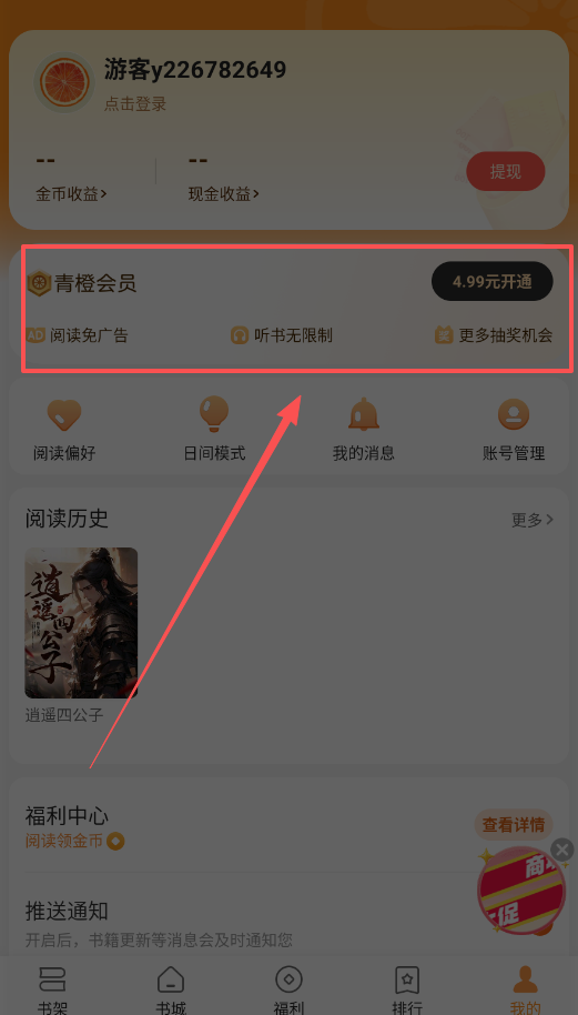4、别忘了打理“我的”页面,你可以花4.99元开通青橙会员来去除广告、解锁听书权限。