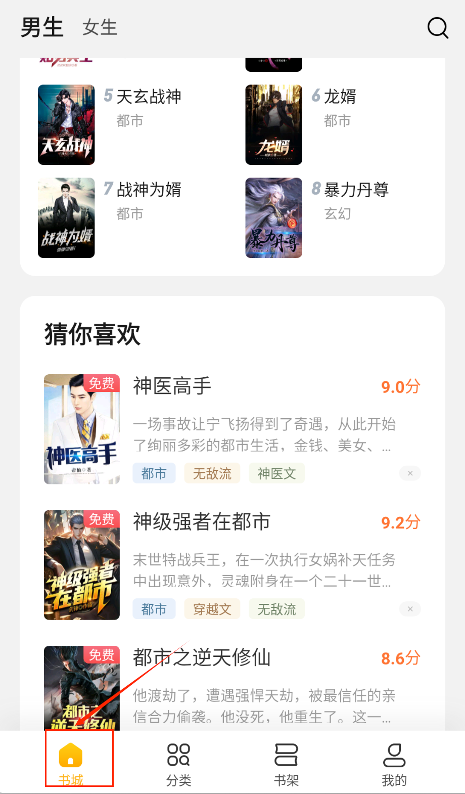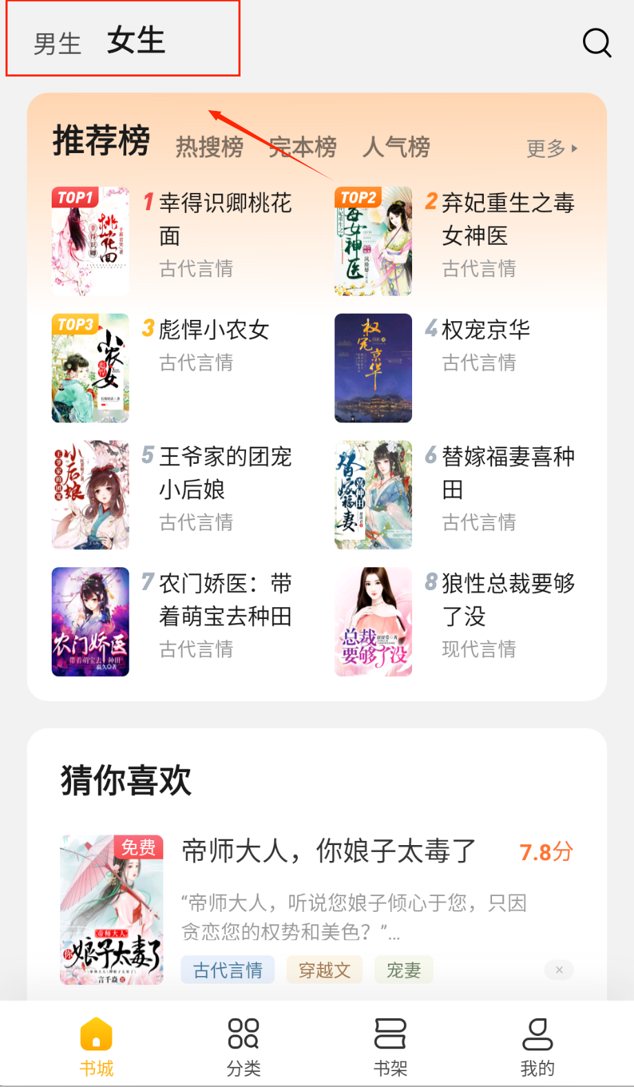 2、通过底部导航栏切换男女频道专区,男频主打玄幻修仙和体育竞技类作品,女频专注总裁言情和穿越重生题材,利用搜索框输入关键词。
